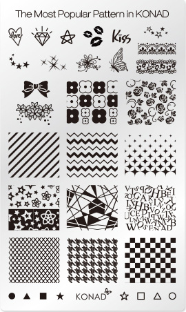 Todas las placas Konad tienen grabada la marca Konad en la parte anterior. En la parte posterior las placas rectangulares tienen un adhesivo protector con la marca Konad, que no debe ser retirado.