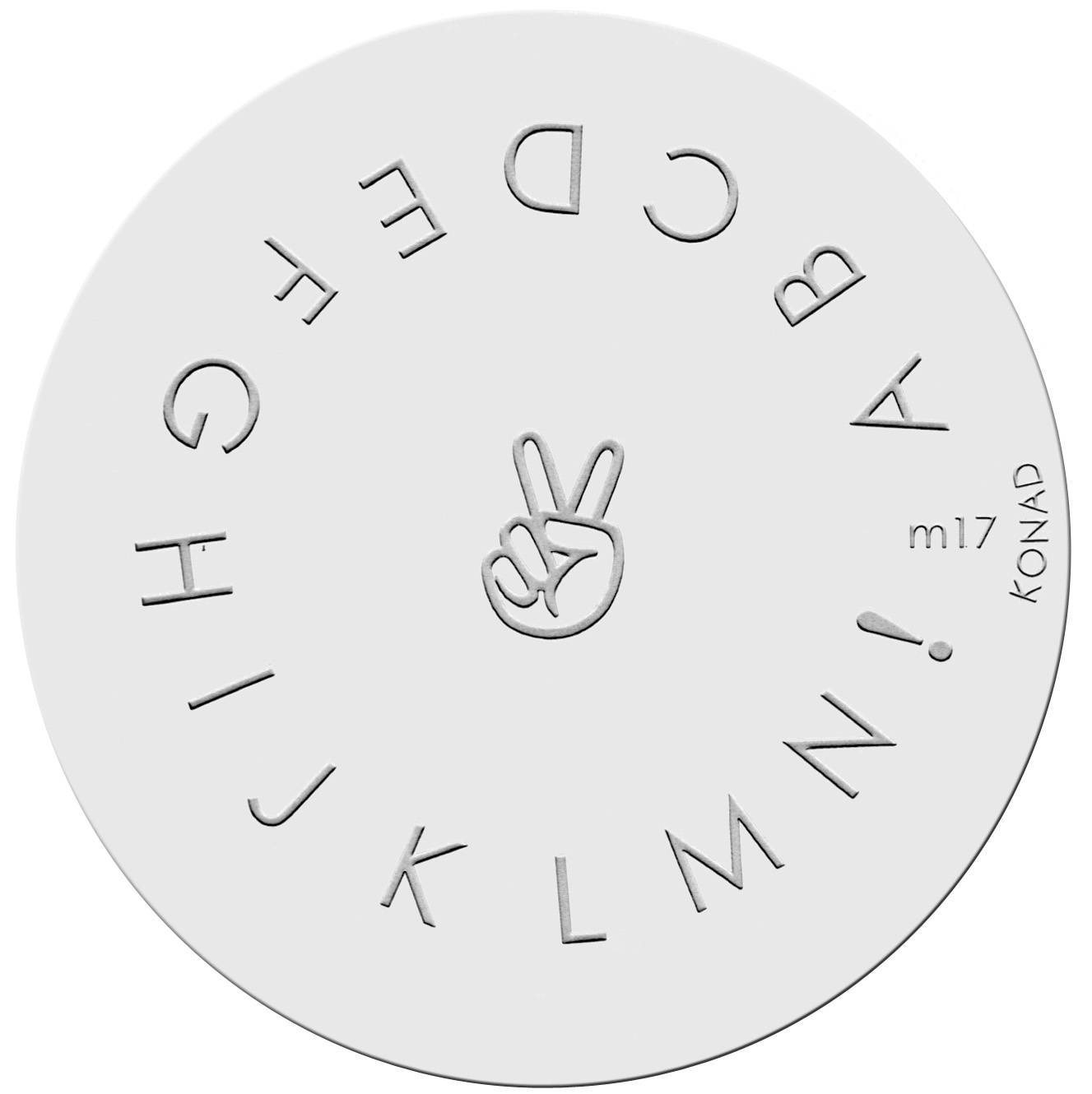 Todas las placas Konad tienen grabada la marca Konad en la parte anterior. En la parte posterior las placas pequeñas redondas tienen un adhesivo protector con la marca Konad, que no debe ser retirado.